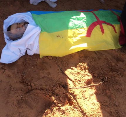 On aperçoit une dépouille mortelle enveloppée dans un drapeau amazigh, ce qui est, il faut le dire, rare dans le monde amazigh. Ce geste symbolique est loin d’être anodin. Cela montre tout simplement l’attachement des habitants d’Adrar n Infusen à leur amazighité comme cela signifie aussi que parmi ceux qui se battent y en a qui le font aussi pour l’amazighité.
