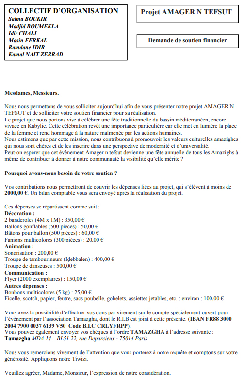 Par la même occasion, le Comité "Amagr n Tefsut" lance un appel à contribution financière afin de mener à bien son action.