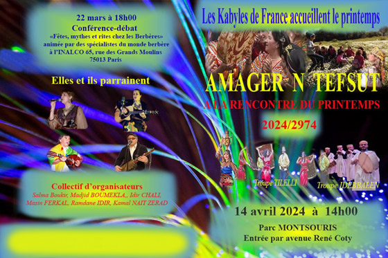 Le collectif "Amagr n Tefsut" célèbre le Printemps à Paris le 14 avril 2024 de 14h à 18h au Parc Montsouri dans le 14e arrondissement. Il invite la communauté berbère en Région parisienne ainsi que ses amies à venir partager un moment festif et de convivialité.