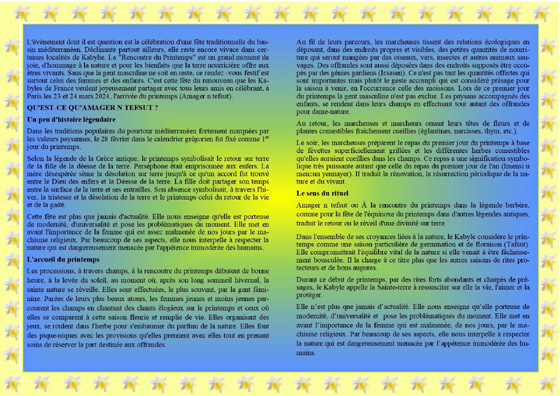 Le Collectif "Amagr n Tefsut" à l’initiative de cette célébration du Printemps qu’il présente comme un hommage rendu à "la nature malmenée par les actions humaines" entend œuvrer pour faire de cet événement "Amagr n tefsut" une fête annuelle de tous les Amazighs à même de contribuer à donner à notre communauté la visibilité qu’elle mérite.