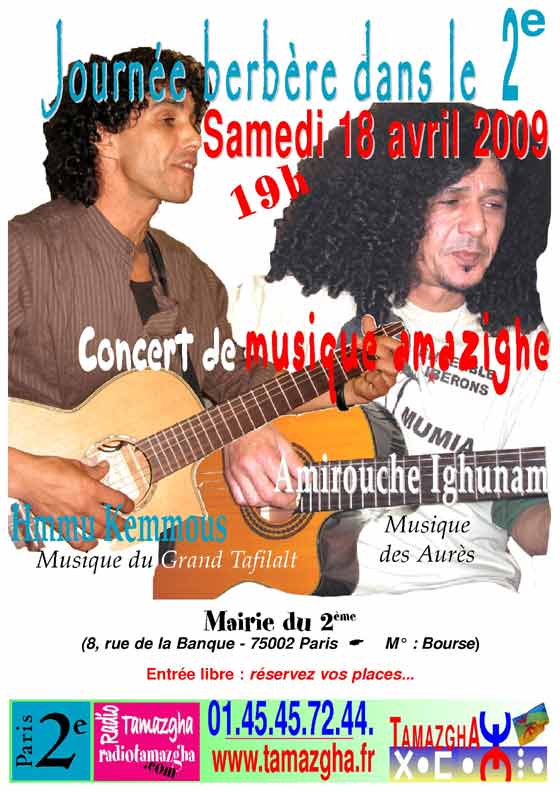 A l’occasion de la journée berbère dans le 2e à Paris, Amirouche Ighunam et Hmmu Kemmous seront en concert de 19h à 21h30 à la salle des mariages de la Mairie du 2e.