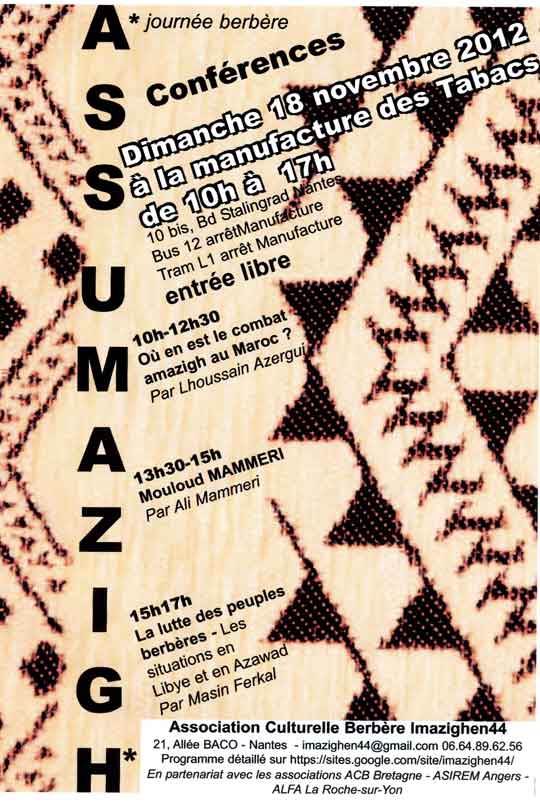 L’association de culture berbère (ACB) à Nantes organise en collaboration avec l’ACB-Bretagne (Rennes), ASIREM (Angers) et ALFA (Roch-sur-Yon) une journée consacrée à Tamazight "Ass umaziγ", le dimanche 18 novembre 2012 de 10h à 17h à la Manufacture des Tabacs à Nantes.
