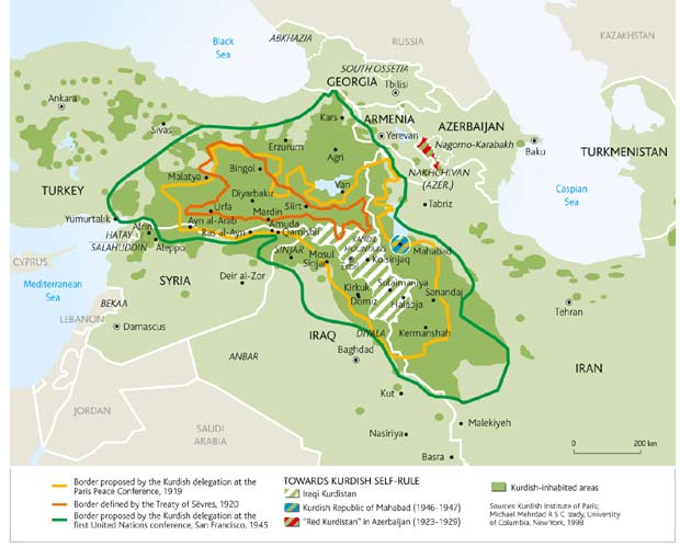 [6] L’éphémère République kurde de Mahabad est proclamée le 22 janvier 1946 et dissoute par les troupes du chah Mohammed Reza en décembre de la même année. Qazi Muhammad, président de la République de Mahabad a profité de la crise irano-soviétique pour proclamer l’indépendance de ce territoire kurde, une initiative qui a bénificié du soutien des Soviétiques. Après la disparition de la république, Qazi Muhammad est exécuté en public au centre de Mahabad. Cette République, même éphémère, reste un élément important dans l’imaginaire kurde et un symbole important pour les indépendantistes.