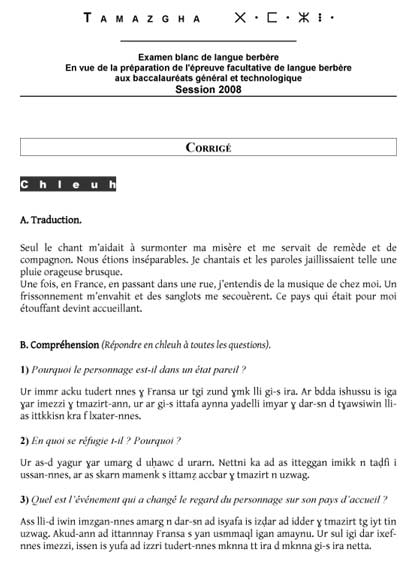 Nous publions dans cet article les corrigés du Bac blanc de la session 2008 qui s’est déroulé le samedi 15 mars 2008 à Paris. Bac blanc organisé par l’association Tamazgha.