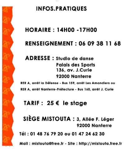Comme tous les ans, Mistouta organise des stages de danses d’Afrique du Nord. Ainsi par cette activité de danse, Mistouta entend contribuer à faire connaître l’une des expressions de cette identité plusieurs fois millénaire.