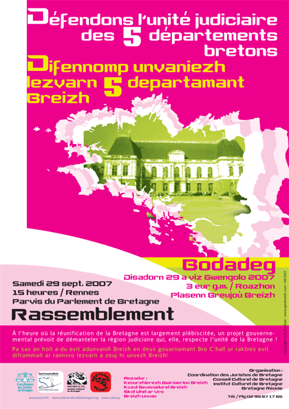 Nous publions, ci-dessous, l’appel du Conseil culturel de Bretagne et de la Coordination des juristes de Bretagne pou un rassemblement devant le Parlement de Bretagne à Rennes le samedi 29 septembre 2007 à 15h. L’objectif étant de défendre l’unité judiciaire de la Bretagne menacée par la réforme de la carte judiciaire projetée par le gouvernement français.
