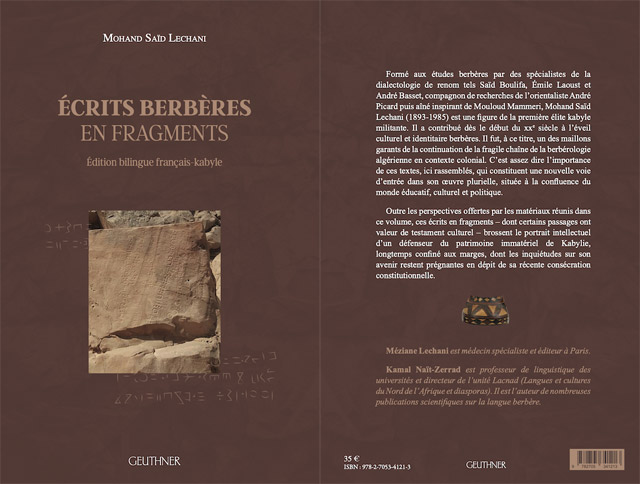 Présentation de l’ouvrage par l’éditeur (Geuthner) : "Formé aux études berbères par des spécialistes de la dialectologie de renom tels Saïd Boulifa, Émile Laoust et André Basset, compagnon de recherches de l’orientaliste André Picard puis aîné inspirant de Mouloud Mammeri, Mohand Saïd Lechani (1893-1985) est une figure de la première élite kabyle militante. Il a contribué dès le début du XXe siècle à l’éveil culturel et identitaire berbères. Il fut, à ce titre, un des maillons garants de la continuation de la fragile chaîne de la berbérologie algérienne en contexte colonial. C’est assez dire l’importance de ces textes, ici rassemblés, qui constituent une nouvelle voie d’entrée dans son œuvre plurielle, située à la confluence du monde éducatif, culturel et politique.
