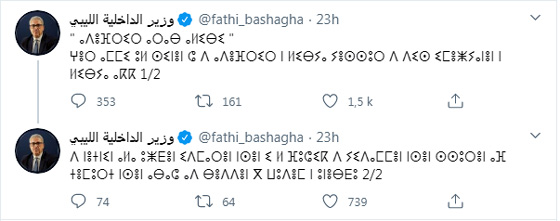 Que ce ministre du gouvernement Saraj clarifie les choses et réponde à la propagande du criminel et raciste Haftar, cela est la moindre des choses, faudrait-il le faire de manière beaucoup plus que conséquente que par un simple Tweet, combien même il est écrit en tifinagh. Mais faudrait-il aussi rappeler que ce gouvernement dit d’entente nationale, certes reconnu par les Nations unies, n’est pas vraiment l’ami des Amazighs, un gouvernement que les Amazighs ne reconnaissent pas dans la la mesure où il ne répond pas à leurs exigences au sujet de l’Amazighité. Aussi, les véritables positions de ce ministre en personne qui seraient en contradictions avec ce que les Amazighs exigent pour l’Etat libyen qu’ils veulent un Etat qui ne soit ni entre les mains des militaires ni entre les mains des religieux et qu’il soit respectueux de la diversité culturelles, linguistique et ethnique de la Libye.