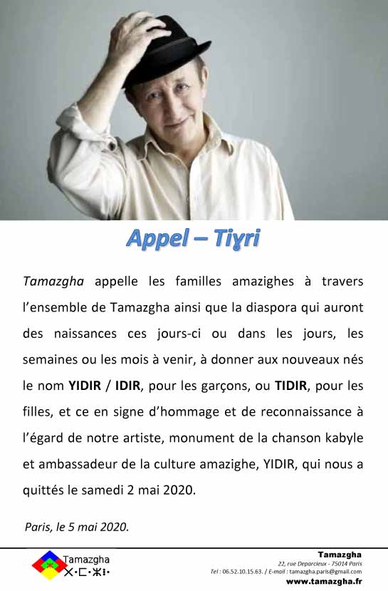 Tamazgha appelle les familles amazighes à travers l’ensemble de Tamazgha ainsi que la diaspora qui auront des naissances ces jours-ci ou dans les jours, les semaines ou les mois à venir, à donner aux nouveaux nés le nom YIDIR / IDIR, pour les garçons, ou TIDIR, pour les filles, et ce en signe d’hommage et de reconnaissance à l’égard de notre artiste, monument de la chanson kabyle et ambassadeur de la culture amazighe, YIDIR, qui nous a quittés le samedi 2 mai 2020.