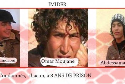 La dernière condamnation en date est celle de trois militants du Mouvement sur la voie de 96, arrêtés arbitrairement le 1er mars dernier. Il s’agit de Omar Moujane, Brahim Hamdaoui et Abdessamad Madri. Ces trois militants ont été condamnés le 24 avril 2014 à trois ans de prison ferme chacun par un tribunal de Ouarzazat. Ils ont été condamnés, entre autres, pour "constitution d’un groupe criminel, (…) rassemblement non autorisé, mise en difficulté de projets de développement dans la région, incitation au boycott de l’école, ( …), non comparution devant la gendarmerie royale".