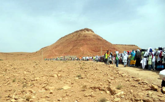 Ce sont, environ huit cents élèves qui ont pris part à une manifestation de protestation et de solidarité sur le mont Alebban où leurs parents tiennent depuis le mois d’août 2011 un sit-in de protestation regroupant des représentants des sept villages de la commune rurale d’Imider. Menée en bon ordre, sur une distance de quatre kilomètres, la marche qui concernait l’ensemble des collèges et du primaire est partie du centre de la commune pour rejoindre la route nationale n° 10 où s’est opérée la jonction avec les élèves venant des autres villages entourant la mine. Les élèves ont escaladé les hauteurs du Mont Alebban, devenu un symbole de la lutte pour la dignité, en scandant des slogans, entonnant des chants berbères et portant des affiches dénonçant la misère et les problèmes liés à l’enseignement après que la délégation provinciale de l’éducation nationale ait décrété la saison 2011/2012 "année blanche".