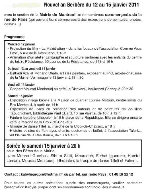 La clôture se fera le samedi 15 janvier 2011 autour d’un spectacle avec plusieurs artistes berbères...