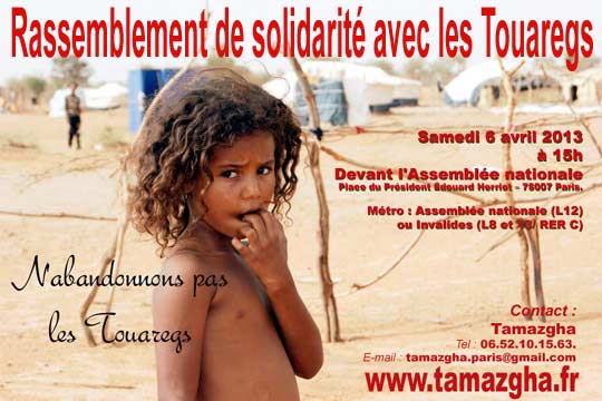 Pour dénoncer ces exactions et l’attitude complice de la France, Tamazgha appelle à un rassemblement devant l’Assemblée nationale le samedi 6 avril 2013 à 15H. Faisons en sorte que nous soyons nombreuses et nombreux pour exprimer notre solidarité avec les Touaregs de l’Azawad qui subissent cette barbarie de l’armée malienne et l’indifférence complice de la France de François Hollande.