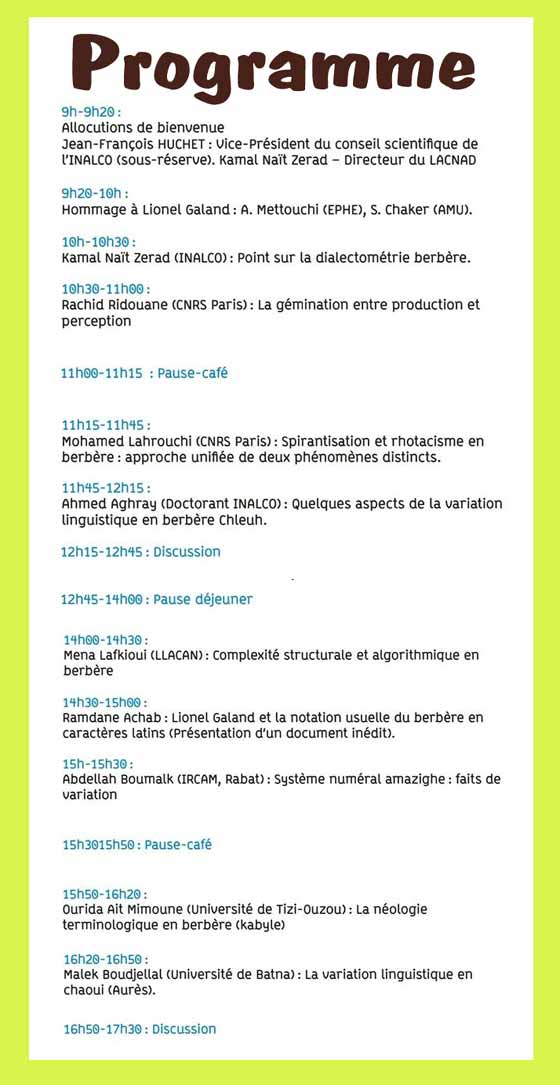 La journée sera également l’occasion de rendre hommage à Lionel Galand, récemment disparu, professeur de berbère à l’Inalco de 1956 à 1977.