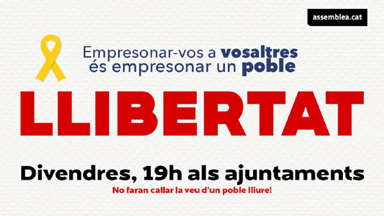 L’Assemblée nationale catalane (ANC) et l’Òmnium Cultural appellent, ce vendredi 3 novembre 2017 à 19 heures, à des rassemblements devant toutes les municipalités du pays pour réclamer la libération des dix prisonniers politiques répartis dans les différentes prisons espagnoles, et exiger également la libération immédiate des membres du gouvernement catalan et des deux dirigeants de l’ANC et d’Omnium Cultural, Jordi Sànchez et Jordi Cuixart, emprisonnés depuis le 16 octobre 2017.