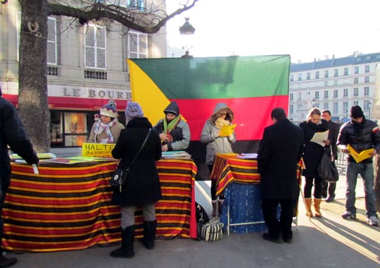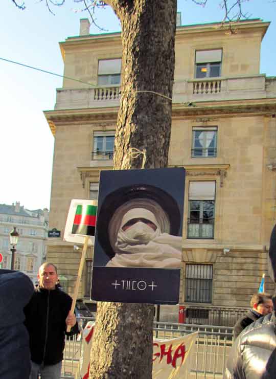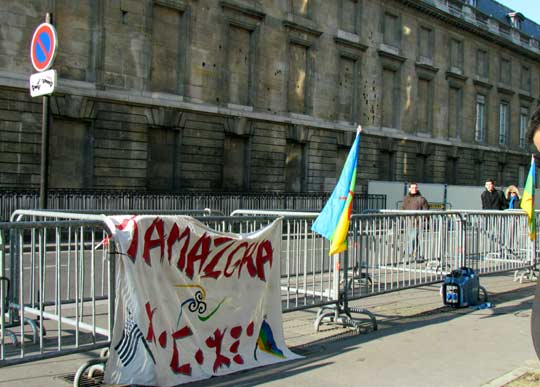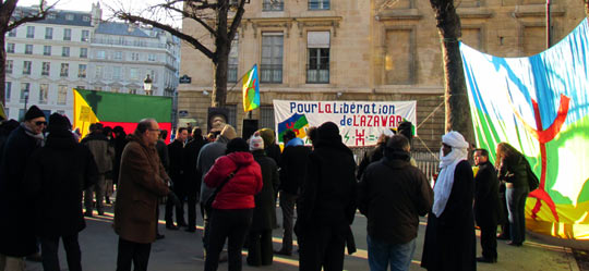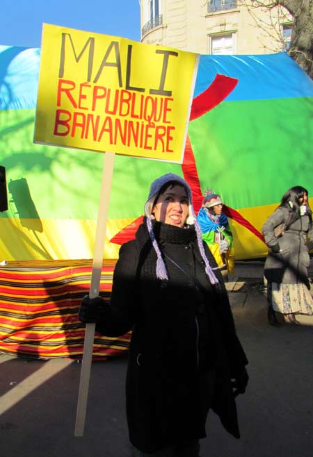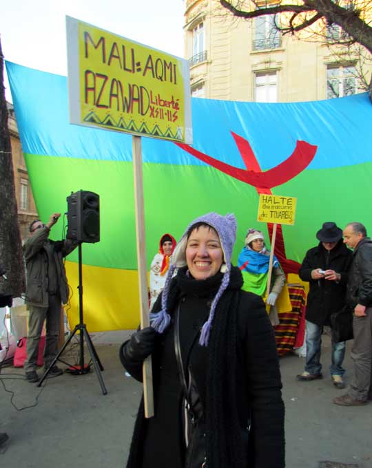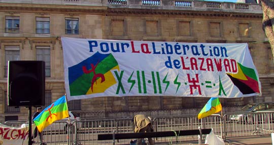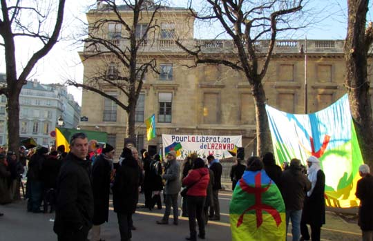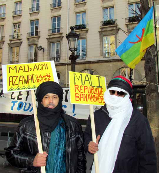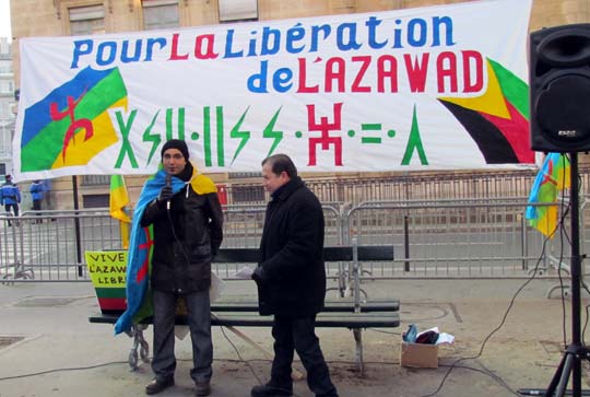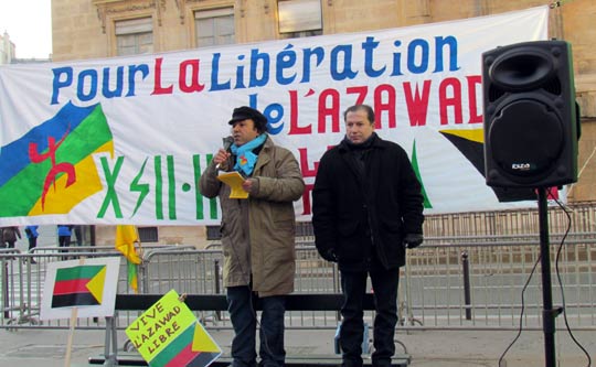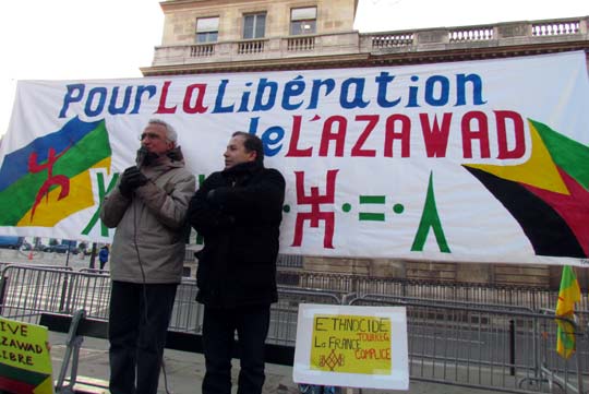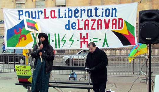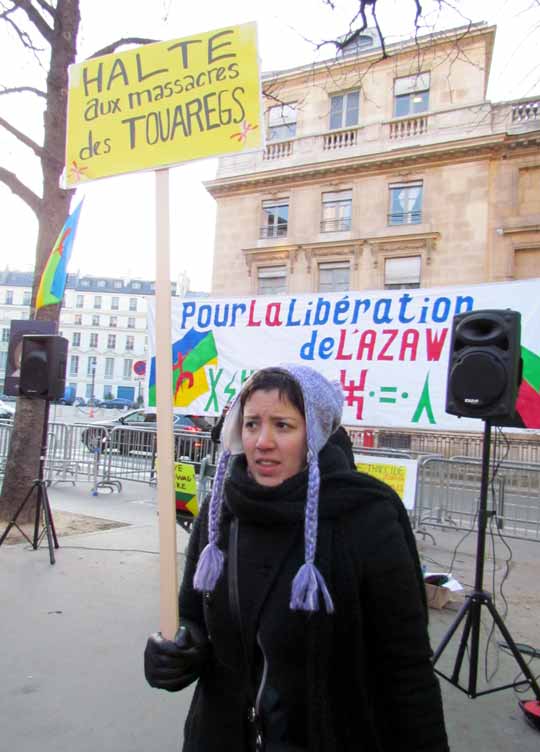 Quelques cent cinquante personnes ont défié le froid glacial de ce samedi 4 février à Paris et ont répondu à l’appel de Tamazgha pour exprimer leur soutien au combat de libération de l’Azawad. Ainsi, la Place Édouard Herriot devant l’Assemblée nationale à Paris était aux couleurs amazighes avec le géant drapeau amazigh et un drapeau de l’Azawad libre. Plusieurs banderoles ont été déployées sur la place. On pouvait ainsi lire : "Halte au génocide des Touaregs !", "Tanekra dagh temoust " en tifinagh ou encore "Pour la libération de l’Azawad – Tilelli i Azawad". Des manifestants portaient également des pancartes dénonçant l’État malien ou qui demandent la liberté à l’Azawad ("Mali = AQMI – Azawad = Liberté", "Halte aux massacres des Touaregs !", "Azawad libre", etc.).