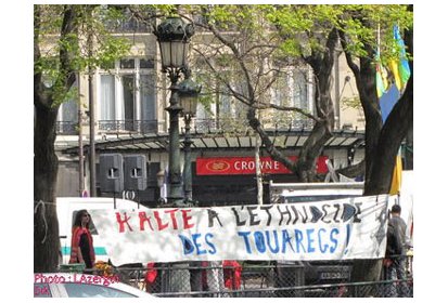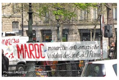 Plusieurs banderoles ont été déployées sur la Place de la République dominée par les couleurs du drapeau amazigh ("Halte à l’ethnocide des Touaregs", "Maroc, une monarchie anti-amazighe et de violation des droits de l’homme", "Détenus politiques du MCA : Tamazgha est à vos côtés", "Halte aux persécutions des militants du MAK", "France-Areva : Uranium contre Touaregs").