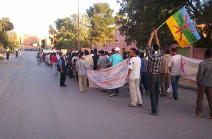 Parmi les villes qui ont vu des militants amazighs sortir dans la rue, il y a Imteghren [1]. Des militants indépendants ont sillonné les rues de la ville pendant plus de deux heures (de 16h00 à 18h30) en scandant des slogans qui réclament l’officialisation de tamazight tel "tamazight nationale, elle sera officielle". Bien qu’encerclés par un arsenal important des forces d’oppression, les jeunes amazighs d’Imteghren et la région ont fustigé le pouvoir marocain en l’accusant d’être le responsable des malheurs qui frappent Imazighen. Ainsi, ont-ils, par exemple, scandé "A lmexzen a bu tillas, baraka n tkerkas" (= pouvoir obscurantiste, y en a marre des mensonges).