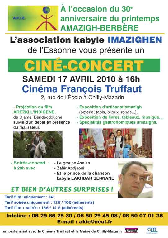 L’association kabyle Imazighen de l’Essonne organise une journée d’activités à l’occasion du Printemps berbère, le samedi 17 avril 2010 à Chuilly-Mazarin. Au programme, expositions, projection-vidéo et musique.