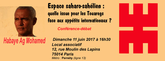 Tamazgha organise une conférence-débat avec Habaye Ag Mohamed sur le thème "Espace saharo-sahélien : quelle issue pour les Touaregs face aux appétits internationaux ?", le dimanche 11 juin 2017 à Paris (12, rue Moulin des Lapins - 75014 Paris).