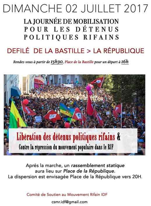 Le Comité de Soutien au Mouvement Rifain IDF appelle à la mobilisation en région parisienne. Il organise une manifestation suivie d’un rassemblement statique le dimanche 2 juillet 2017 à Paris. C’est pour "la libération des détenus politiques rifains et contre la répression de la mouvance politique dans le RIF".