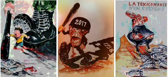 Les militaires, outils de la répression, sont aussi particulièrement visés. Ils portent d’énormes bottes, ont l’allure de zombies assoiffés de sang, les yeux globuleux, injectés du sang. Ils sont bêtes et sauvages. Ils écrasent des enfants, défoncent des portes et font éclater des têtes.