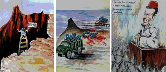 Ces œuvres montrent la démocratie enterrée dans un abîme sans fond, des militants pacifistes devant des juges incultes, corrompus, suspendus aux ordres. Le Rif est écartelé, assiégé, mais résiste.