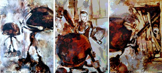 D’énormes casques noirs dominent les tableaux peints avec un mélange de café et de vin rouge. Ils sont portés par des êtres en bottes, armés de puissants gourdins. Barbares aux noirs desseins. Des militaires haineux prêts à opprimer, à violer et à torturer. Ils sèment la peur et la répression. Face à eux, des manifestants, minuscules et lointains. Sur les tableaux, les militaires ressemblent à des Fourmies géantes prêtes à en découdre. Du sang perle de leurs bouches ouvertes, similaires à celles de zombies. Elles suintent. « C’est pour laisser comprendre qu’il s’agit d’une invasion du Rif », me dit-il.