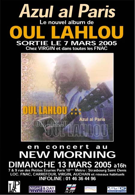 A l’occasion de la sortie de son nouvel album "Azul a Lpari", Oulahlou sera en concert au New Morning le 13 mars 2005 à 16H00.