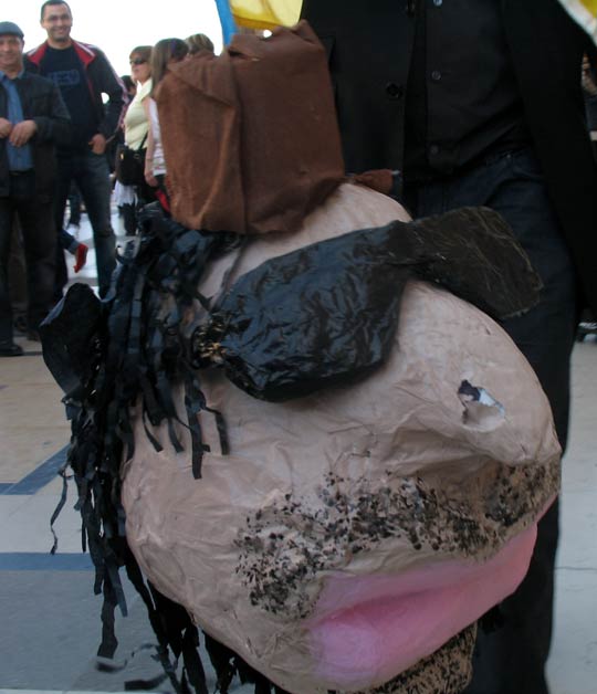 Le 9 avril 2011, à l’issue du rassemblement organisée par Tamazgha et d’autres organisations amazighes, en soutien aux Libyens en lutte, les manifestants se sont défoulés symboliquement sur la tête du despote de Tripoli... et ils l’ont cassée...