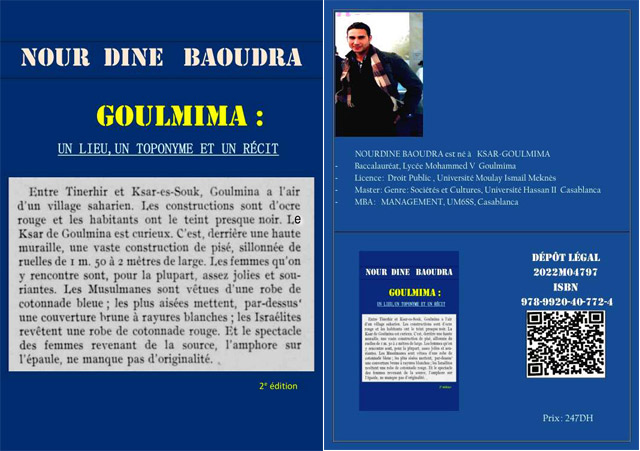C’est d’un livre sur la toponymie de la région de Ghéris dont nous gratifie Nour Dine Baoudra. « Goulmima : un lieu, un toponyme et un récit », publié à Casablanca, est d’une importance considérable notamment pour la préservation de la mémoire collective. En filigrane, l’auteur raconte l’histoire de certains membres de sa famille qu’il découvre en travaillant sur le projet de ce livre. Celle-ci est parfois tragique. Des anecdotes liées à certains lieux meublent également ce récit qui relève à la fois de la micro-histoire et de l’anthropologie.