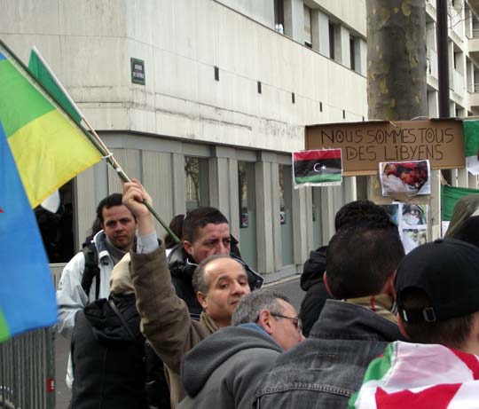 Ce mardi 22 février 2011, un rassemblement de jeunes étudiants libyens devant la représentation diplomatique du régime de Kdhafi à Paris a été dispersée par la police. Les jeunes manifestants ont été brutalement délogés devant l’ambassade. Il ont finalement pu se rassembler à une cinquantaine de mètres plus loin rejoints par d’autres manifestants.
