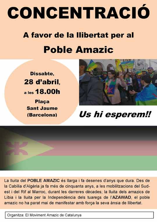 Le Mouvement amazigh de Catalogne organise un rassemblement en faveur de la libération du peuple amazighe à Barcelone le samedi 28 avril 2012 à 18hh.