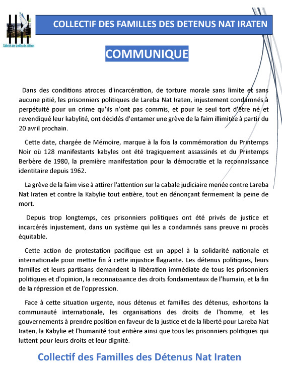 Le Collectif des familles des détenus Nat Iraten nous a fait parvenir le 14 avril un communiqué par lequel il annonce que les détenus, condamnés à mort dans l’affaire dite "de Laṛebɛa n At Yiraten" ont décidé d’entamer une grève de la faim illimitée à partir du 20 avril 2024.