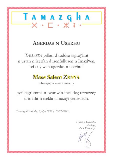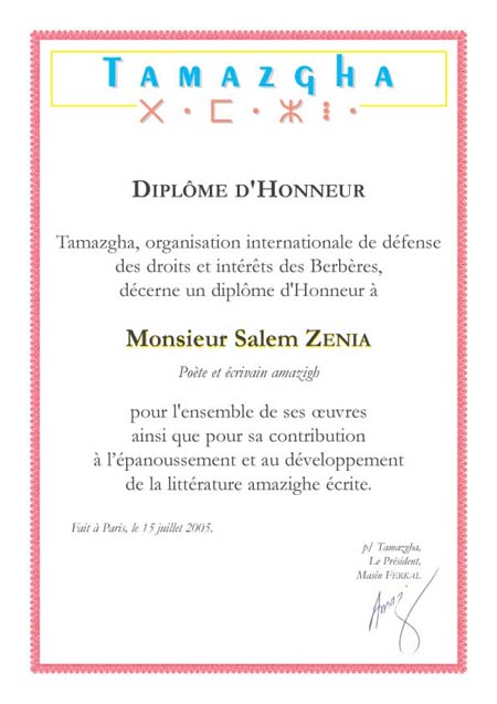 Le 15 juillet 2005, à l’issue de la rencontre débat ayant eu lieu à Paris, Salem Zenia s’est vu décerner un diplôme d’honneur pour l’ensemble de ses œuvres ainsi que pour sa contribution à l’épanouissement et au développement de la littérature amazighe écrite. Tamazgha, organisatrice de la rencontre et émettrice du diplôme d’honneur voulait à travers cette action rendre hommage à l’écrivain berbère. Ce dernier, rappelons-le, ne peut voir son œuvre consacrée que par les siens. Les institutions étatiques, les diverses organisations mondiales, tout comme les éditeurs sont peu sensibles à la littérature berbère écrite pour ne pas dire ils l’ignorent totalement. Donc, c’est aux Berbères qu’il revient d’œuvrer sa consécration. Comme il faut créer des traditions, des prix littéraires... Tamazgha a pris l’initiative de contribuer à sa façon à cette entreprise. En attendant que les Berbères se dotent d’Etats à même de prendre en charge effectivement la langue berbère, toute action pouvant aller dans le sens de la promotion de cette littérature est à encourager.