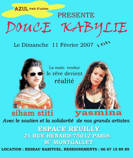 Les chanteuses kabyles, Siham Stiti et Yasmina, se produiront à l’Espace Reuilly à Paris le dimanche 11 février 2007 à 16h00.