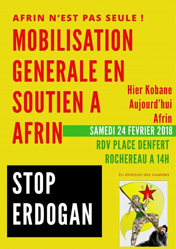 Dans cet ordre d’idées, plusieurs organisations regroupées dans le Collectif Afrin n’est pas seule ! appellent à une manifestation de solidarité avec le peuple kurde à Afrin, à Paris le samedi 24 février 2018. La manifestation partira de Denfert Rochereau à 14h en direction des Invalides. La dispersion est prévue à 18h.