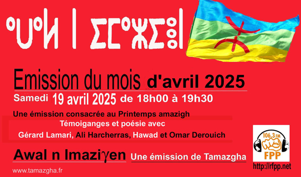 Émission "Awal n Imaziɣen" de Tamazgha, difféusée le samedi 19 avril 2025 sur les ondes de radio "Fréquence Paris Plurielle" (106.3 FM)