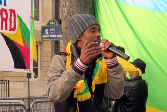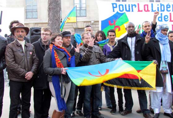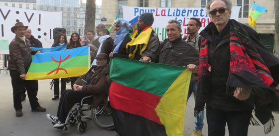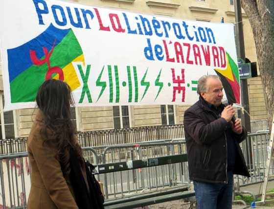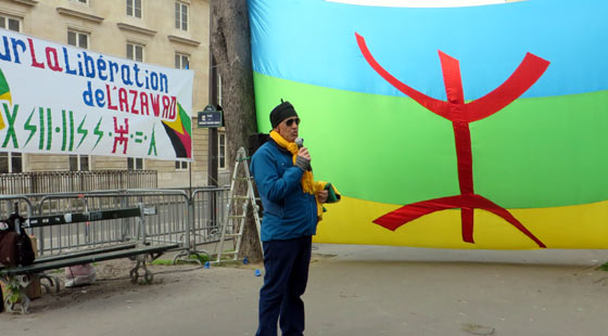 Masin Ferkal, représentant Tamazgha, prend la parole pour rappeler que ce rassemblement a été voulu pour exprimer la solidarité avec les Touaregs qui se battent dans l’Azawad contre l’oppression, l’injustice, la dictature et cette alliance internationale qui veut absolument anéantir l’Amazighité et le Touareg. Après avoir faire un bref rappel de la longue lutte des Touaregs qui remonte notamment au départ du colonialisme français en 1960 qui avait décidé d’annexer les Touaregs à des Etats créés de toute pièce par la France, il revient sur les derniers pourparlers entre les mouvements de l’Azawad et le Mali qui ont abouti à la mascarade d’Alger du 1er mars 2015. Laquelle mascarade, précise-t-il est rejetée par l’ensemble des populations de l’Azawad. Il a rappelé que les populations de l’Azawad, et en première ligne la femme, ne cessent de marteler depuis fin février qu’elles ne veulent que l’indépendance, rien que l’indépendance de l’Azawad. Il a dénoncé les pressions de la communauté internationale, à sa tête la France, sur les Mouvements de l’Azawad afin qu’ils signent les accords concoctés par Alger. Au passage, il dénonce l’attitude des autorités françaises qui ont refusé de délivrer un visa un une dirigeante du MNLA qui tenait à faire le déplacement pour participer au rassemblement de Paris. Il assure que Tamazgha s’inscrit dans une seule voie, celle de la lutte pour l’indépendance de l’Azawad. Même s’il faut s’attendre à de violentes réactions de la part des ennemis de cette indépendance. A ce sujet, il met en garde la communauté internationale quant aux exactions qui risquent de viser les populations civiles de l’Azawad en représailles à la non-signature des accords par les mouvements de l’Azawad. La communauté internationale, la France en particulier, doivent faire attention à ce que les exactions auxquelles sont habitués les Azawadiens ne se répètent pas. Il appelle la France à avoir un œil sur ce que fait Alger dans la région, car, selon lui, l’Etat algérien n’hésitera pas à réactiver ses réseaux terroristes-islamistes dans l’Azawad, ces islamistes qu’Alger se donne le droit de faire agir dans l’Azawad pour punir les Touaregs. La France ne doit pas cautionner le projet criminel de l’Etat algérien dans l’Azawad pour lequel tous les moyens sont bons pour saboter le projet indépendantiste de l’Azawad et afin d’associer le combat de l’Azawad au terrorisme islamiste. "Nous tenons à assurer nos frères Touaregs qui se battent dans l’Azawad pour leur indépendance et pour leur liberté que nous irons jusqu’au bout avec eux. Tant que le combat est un combat pour la liberté, pour la dignité, on sera là et on fera tout ! Et on fera tout pour faire entendre la voix de l’Azawad, la voix de la liberté, la voix de la dignité". Il a tenu, au nom de Tamazgha, à rendre un hommage particulier aux braves femmes touarègues qui n’ont pas cessé de se battre et se mettre en première ligne depuis janvier 2012. "Soyons solidaires de ce qui se passe dans l’Azawad. Soyons attentifs à ce qui se passera dans les jours qui viennent et restons mobilisés et prêts pour dénoncer toute atteinte aux droits des Azawadiens." a-t-il conclu.