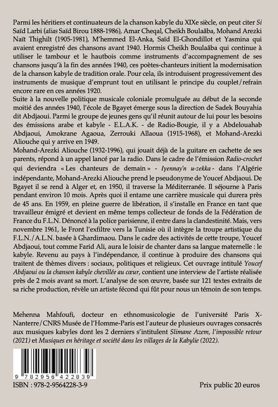 Une partie de l’ouvrage est dédiée à la transcription et à la traduction littérale des chansons de Youcef Abdjaoui. Ce riche corpus est composé de 121 textes, dont 91 figuraient dans le manuscrit tenu par le chanteur lui-même- il fut l’un des rares chanteurs kabyles de l’époque à fixer ses textes-, avec pour certains la mention du registre musical dans lequel ils étaient chantés, 30 autres retranscrits à partir des versions audios publiées. Auteur-compositeur, Youcef Abdjaoui a écrit et composé pour Bahia Farah, Farida, Djamila, etc., mais il a également chanté une quinzaine de textes écrits par Kamal Hamadi.