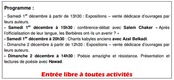 Un grand débat avec Salem Chaker, le 1er décembre 2018 à 15h30 ; une rencontre autour de la poésie avec Hawad, le 2 décembre à 14h30 et de Chants kabyles anciens avec Azal Belkadi, le 1er décembre à 20h30.
