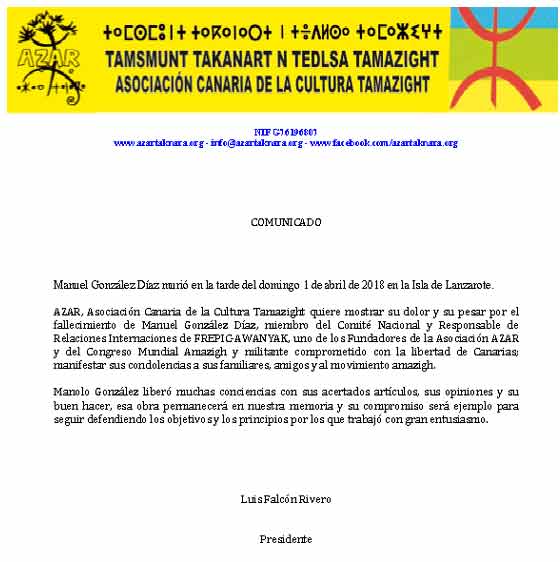 AZAR , Asociación Canaria de la Cultura Tamazight quiere mostrar su dolor y su pesar por el fallecimiento de Manuel González Díaz, miembro del Comité Nacional y Responsable de Relaciones Internaciones de FREPIC-AWANYAK, uno de los Fundadores de la Asociación AZAR y del Congreso Mundial Amazigh y militante comprometido con la libertad de Canarias ; manifestar sus condolencias a sus familiares, amigos y al movimiento amazigh.