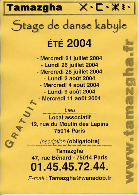 L’association Tamazgha organise un stage de danse kabyle dans le XIVeme arrondissement de Paris du 2& juillet au 11 août 2004.