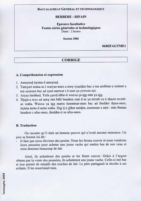 Ci-après le corrigé du sujet rifain de la session 2006 de l’épreuve de berbère au baccalauréats général et tecnologique en France L’épreuve a eu lieu le mercredi 22 mars 2006.