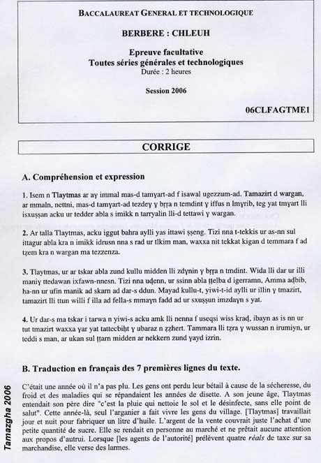Berbère au Bac en France : Session 2006 - corrigé du sujet chleuh