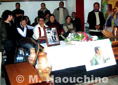 A-t-il quelque chose à avoir avec ses derniers visiteurs, sa génération, son peuple. A-t-on tenté d’interroger le néant. Oui et non. Tout et rien. Autres errements. Mohya n’aimerait pas qu’on pose ce genre de questions. Au lieu de se perdre en questionnements, lui qui aurait gagné ce temps à travailler. Alors passons et laissons-le prendre sa retraite méritée. Etant toujours vivant, on aurait profité davantage de son génie sou poudré naïvement de situations de campagnards et qui subtilement viole allégrement toutes les frontières des mentalités feintes et "socialement correcte" et des préjugés biens assis sur leur arbitraire de l’Algérie de la cohue des pseudo-militants de la démocratie, de la République. La mort fane et tous les morts se ressemblent, se consoleront ces maudits politiques de la police politique d’ici et d’outre mer. Ce jour, beaucoup des siens sont venus et ont accroché un tissu noir de deuil au-dessus du drapeau algérien. Dehors, sous le préau on échange à petite voix des souvenirs de rencontres, d’anecdotes pressées de sourire non pour détendre l’atmosphère qui tord les boyaux mais une façon dégagée de rendre hommage à celui qui nous a tout le temps fait pouffer en parlant de lui dans des circonstances réservées au recueillement. Dans le hall, des enceintes d’une sonorisation sortent les exclamations, les jurons et les répliques déroutantes de Sifuni, de Lalam-Gillette et de Sinistri, l’une des adaptations magiques de Mohya. Une petite exposition de quelques articles de presse, de l’interview à la revue clandestine Tafsut (n° 10, 1985), des poèmes et de quelques photos de l’adaptateur devant lesquels les nombreux visiteurs s’attardent. Une rareté qui renseigne sur le mépris sélectif porté par les intellectuels de cérémonies sur les génies littéraires mais aussi le caractère marginal du rebelle absent de sous les projecteurs de l’actualité.