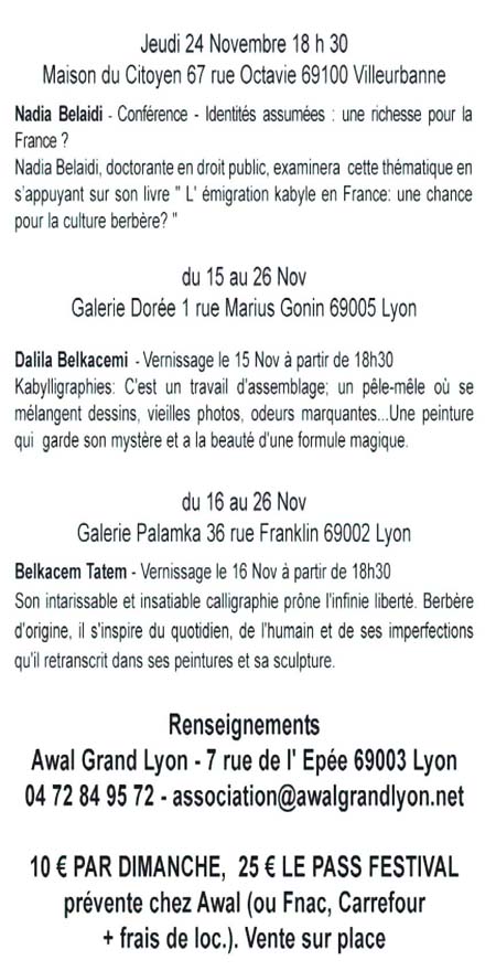 C’est une dynamique de multi-culturalité que l’association AWAL Grand-Lyon inscrit ce festival "Les Découvertes Berbères" dont l’objectif principal est de faire connaître et promouvoir la culture berbère comme élément interculturel et comme expression spécifique pour le grand public.