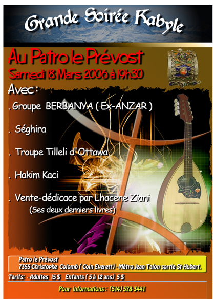 Pour faire la fête, toutes les occasions sont bonnes. Des Kabyles de Montréal se feront une fête le 18 mars 2006 à partir de 19H30 au Patro le Prevost. Au programme, bien sûr de la musique... Mais le public aura également l’occasion de rencontrer le poète kabyle Lahcène Ziani qui dédicacera ses ouvrages récemment publiés.