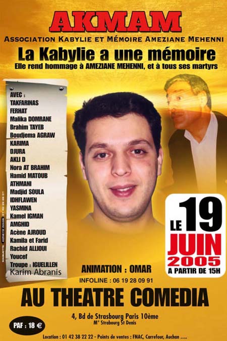 Pour rendre hommage à Ameziane Mehenni, assassiné à Paris le 19 juin 2004, plusieurs artistes kabyles chantent le dimanche 19 juin 2005 à partir de 15H00 au Théâtre Comedia (Paris 10ème). L’activité est une initiative de l’association AKMAM (Association Kabylie et mémoire Ameziane Mehenni).