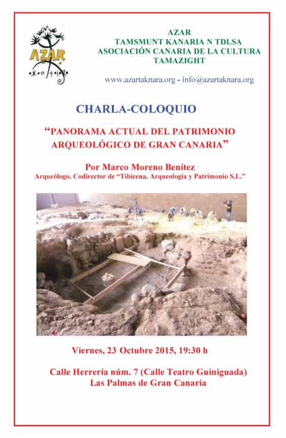 L’association AZAR organise une conférence-débat sur le patrimoine archéologique de l’île de Tamarant (Gran Canaria) avec Marco Moreno Benítez, à Las Palmas le 23 octobre 2015.